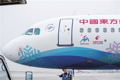 当日,东航首架“亚冬号”彩绘机执飞MU6347航班,搭载首航旅客从上海虹桥国际机场抵达哈尔滨太平国际机场。