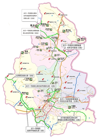 据了解,太行一号旅游公路覆盖了黎城县8个镇120余个村7万余人的范围。将黎城县与周边的襄垣县仙堂山景区、武乡县八路军总部纪念馆、晋中市左权县八路军前方指挥部纪念馆及河北省涉县八路军129师纪念馆等多个红色经典景区串联整合,形成现代经典红色旅游聚集圈新业态。