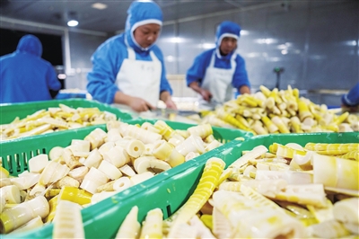11月27日,工人在桃江县马迹塘镇笋竹特色产业园内一家鲜笋加工企业生产车间加工鲜笋。