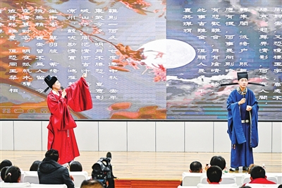 12月12日,长治市第二中学举办“诵读传古韵·经典润人心”诵读大赛。赛场上,学生们将古典诗词、红色经典与舞蹈、乐器等融为一体,用声音传递情感,用语言描绘经典,以朗诵为媒,将古典诗词韵味,与现代文学风采相结合,尽显中华文化的博大精深。 本报记者 司敏 摄