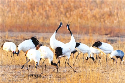 目前,大批丹顶鹤飞抵江苏盐城湿地珍禽国家级自然保护区越冬。该保护区位于黄海之滨,是全球9条候鸟迁飞通道之一的“东亚-澳大利西亚”路线上的重要一站,每年都有超过600只野生丹顶鹤来这里越冬。 新华社发(汤德宏 摄)