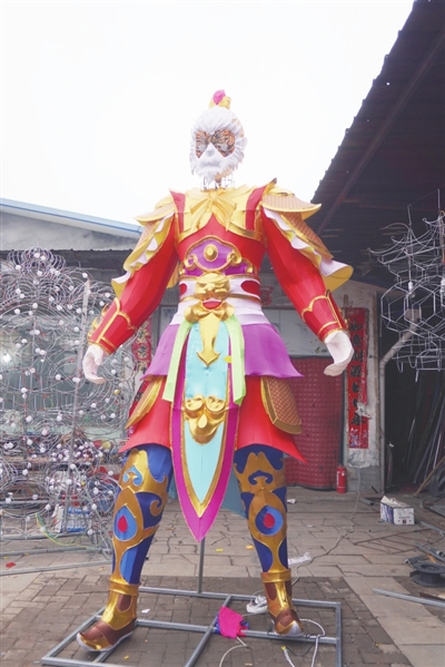 走进宽敞明亮的厂房,映入眼帘的是琳琅满目的花灯制作材料和初具雏形的花灯骨架。制作现场,工人们各司其职,忙得热火朝天。彩绸、灯泡、金属丝等材料在他们的巧手下变成一个个精美的花灯部件。作为今年的“网红”,工人师傅在“黑神话·悟空”花灯的制作上下足了功夫。“花灯的制作工艺非常复杂,首先工匠师傅绘图,然后根据造型下料,之后工人师傅焊接,最后进行手工裱糊。在裱糊过程中,我们需要细心、耐心地操作,这样细节才能做好,呈现出好的视觉效果。”工人王华丽说。