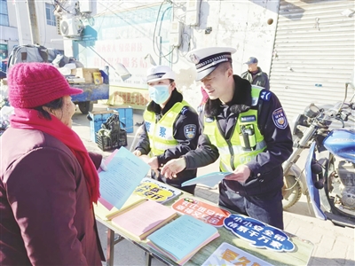 本报讯 记者王晶晶报道:集市上人流如织,正是宣传好时机。为有效预防和减少道路交通事故的发生,近日,沁县交警深入辖区古城村集市现场“摆摊”送安全,向商户和赶集群众讲解交通事故预防措施,提醒群众遵守交通规则,安全文明出行。