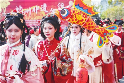 2024年12月31日,“宋韵思潮 寻迹匠心”杭州非遗年货节在杭州市上城区望江街道日信国际广场开市,现场设置非遗、文创、游艺、民俗、群艺五大板块,汇集非遗项目展示体验,穿插民俗文艺表演,同时推出各地年节美食品尝展销,营造杭州特色的市井年味,让市民游客在欢乐喜庆的气氛中感受年味。