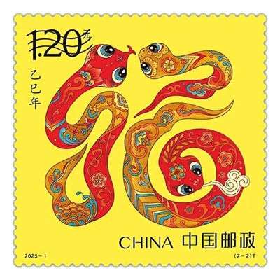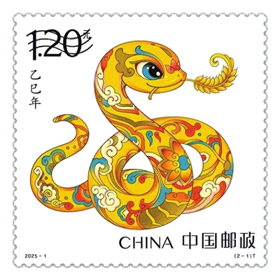 第一枚图为蛇呈丰稔。画面提炼了中华优秀传统文化中盘蛇的灵动意象,加以喜庆装饰应和年节氛围。金色的蛇躯蜿蜒,口中衔着一束“嘉禾”,象征着“仓廪实,衣食足”的美好图景。蛇身金光熠熠,与璀璨的麦穗交相辉映,寓意着风调雨顺之年,五谷丰登之景,以及国泰民安的盛世祥和。第二枚图为福纳百祥。画面以草书笔意将三条蛇创意性地构成了“福”字形,简练洒脱、柔美顺通。两大一小三条蛇之间情感细腻流动,顾盼生情,生动展现了阖家欢乐的温馨场景,寓意着和合共生、福满人间,寄托了人们对美好生活的无限追求与诚挚祈愿。两枚邮票不仅是对生肖之美的再次诠释,更是对盛世安康、福泽四季的深情祝福。