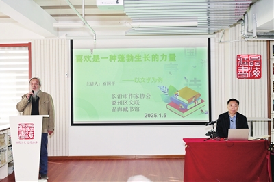 本报讯 记者丁德令报道:与文字结缘,感受文学作品魅力。听作家讲课,激发文学创作灵感。1月5日,由市作协、潞州区文联、市晶海藏书馆联合举办的2025年首场文学讲座开讲,市文艺评论家协会主席石国平以《喜欢是一种蓬勃生长的力量——以文学为例》为题,与我市众多文学爱好者分享创作经验,并畅谈如何在文学写作中发挥想象力。
