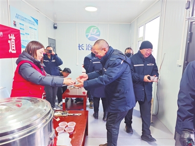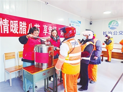 1月7日,潞州区太行西街潞才社区联合辖区学校、餐饮公司等,组织志愿者在潞才社区户外劳动者工会驿站熬制腊八粥,向前来驿站休息的环卫工人、公交司机、外卖配送员等劳动者赠送腊八粥,让他们感受到社会的温暖和关爱。