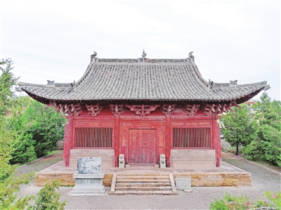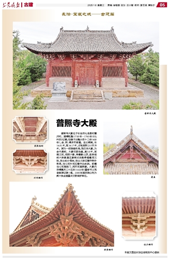 普照寺大殿位于长治市沁县郭村镇开村。据清乾隆(1736年~1795年)《沁州志》记载,创建于北魏太和十二年(488年),金、明、清多次修葺。坐北朝南,长14.81米,宽14.17米,占地面积210平方米。原为一进院落布局,现仅存大殿,为金代遗构。大殿石砌台基,高0.8米,面阔三间,进深六椽,单檐歇山顶,梁架结构六架椽屋五椽栿对后剳牵通檐用三柱,柱头收分卷刹,柱头斗拱五铺作单杪单昂,当心间补间五铺作出斜拱。前檐当心间施板门、两次间直棂窗。大殿内存清嘉庆二十五年(1820年)重修节义观音堂碑记碑1通。2006年国务院公布为第六批全国重点文物保护单位。