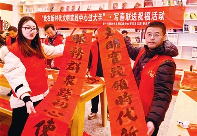 本报讯 记者王晶晶报道:春晖渐近旧岁去,一元复始万象新。1月7日,壶关县新时代文明实践中心联合县文联、县书法协会开展“我在新时代文明实践中心过大年”写春联送祝福活动,邀请书法志愿者为辖区群众写春联、送祝福,给大家送上满满春节“福”气。