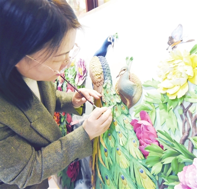 学习之路,绝非坦途。堆锦制作工序繁复,从选料用料、设计图案、剪出板样,到蒙上所需色彩的丝绸锦缎、絮入棉花,再到“拨折捏褶”,呈现出立体感和层次感,再到用特殊的颜料彩绘出细节,对人物、花鸟的巧妙装饰等,需经十几道工序,每一步都考验着制作者的耐心与技艺。韩玲从基础学起,谨遵师训,苦练线条,精研裁剪、“贴飞边”、絮棉花等技法。涂必成不仅传授韩玲技艺,更将传承的使命交付于她,生前常对她说:“我们只有传承的权利,没有放弃的权利。”师傅的话她铭记于心,并用行动践行着传承重担。