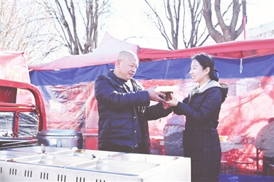 | 腊八节当天,漳泽农商银行工作人员为辖区内商贩送上暖心“粥”。在送上节日祝福的同时,工作人员还为商贩宣传讲解了防范电信诈骗的相关知识,进一步增强了大家抵制电信诈骗的“免疫力”。 李雪 摄 |