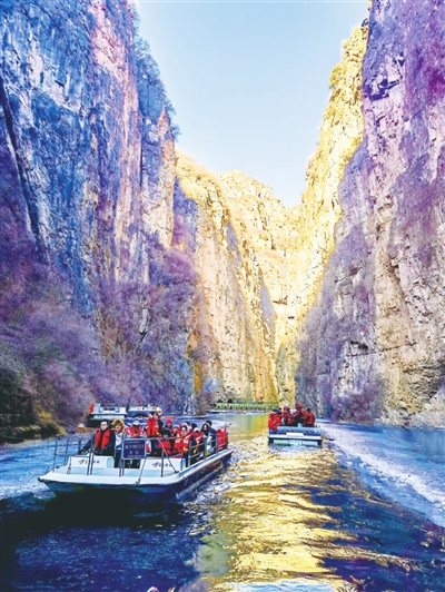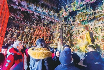在观音堂,达人们被500尊流光溢彩的神佛悬塑深深震撼;在通天峡,于冬日乘船游太行山水,观十里冰挂,沉浸式体验峡谷中的“冰河世纪”;在欢乐太行谷,大家或加入社火表演队伍载歌载舞,或在不夜城中与“神仙”对话,遥远的故事在此刻生动起来;在振兴小镇,游龙舞狮、高台花鼓、上党八音会……一连串的非遗展演让人目不暇接,提前过上了热闹非凡的中国年,达人们纷纷举起相机,记录下这精彩的瞬间。