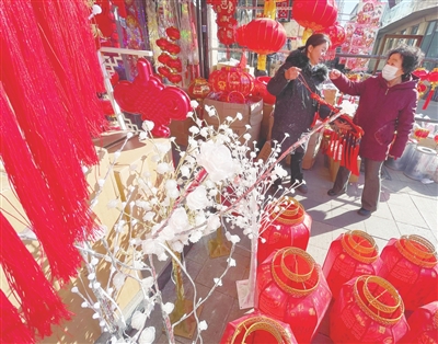 灯笼火红高挂,春联载福寄愿,年货琳琅满目……随着春节脚步临近,批发春节饰品的店铺张灯结彩、人头攒动。福字、中国结等节庆饰品成为“气氛担当”摆满货架,温馨熟悉的年味正缓缓包裹着市区的大街小巷,肆意弥漫在每一个角落,进入家家户户。