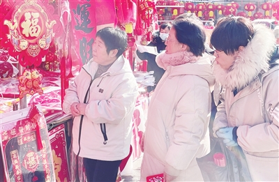 在英雄台小商品市场内,商户王女士正忙着招呼前来选购的顾客。她告诉记者,从2024年12月中旬开始,便陆续进入了批发售卖旺季,店内有灯笼、春联、福字等装饰用品上百个品类。“周末人流量大,其中带有生肖元素的福字、春联等卖得最好。”王女士说。