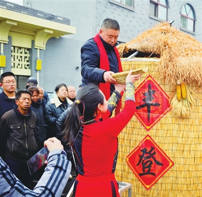“填仓会”上,来自该镇各村的群众代表,把自己带来的五谷杂粮填在大粮仓里,寓意每年添置新粮“填仓纳福”,感恩天地赐予的丰收,祈求来年风调雨顺。