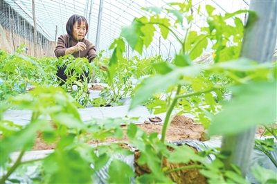 近日,在上党区郝家庄镇白家沟村蔬菜种植大棚,村民在温室大棚内管护西红柿苗。