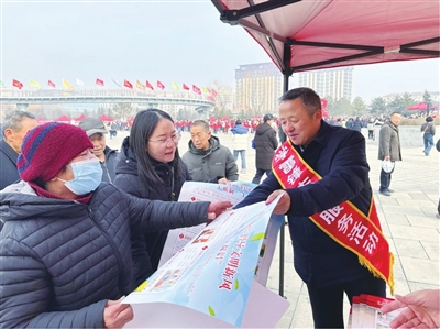近日,全国岗位学雷锋标兵宋卫国在潞城区世纪广场向过往群众宣传安全知识,并向他们发放安全文明宣传画册。本报记者 王晶晶 摄