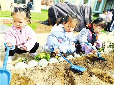| 阳光正好、微风不燥,随着天气转暖,连日来潞城公办综合托育服务中心增加了孩子们每天户外活动时间。在每天2~3小时的户外活动中,孩子们在老师的带领下,在菜园里翻土、播种、浇水,一张张红扑扑的小脸上洋溢着开心的笑容,不仅体验了播种的乐趣,还感受了种植的意义。 本报记者 王敏 摄 |