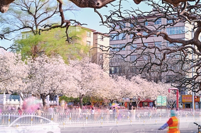 在市八一广场,连片的樱花如期绽放,满树的花朵如云似霞,在微风中轻轻摇曳,散发出迷人的芬芳。春风拂过,花瓣如雪飘落,洒在肩头、发梢,仿佛置身于一场浪漫的粉色花雨之中,引得游客纷纷拿出相机,定格这美好瞬间。