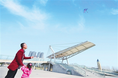 近日,在潞州区淮海公园里,家长和孩子在放飞风筝。风筝与公园内展翅欲飞的现代建筑造型相映成趣,勾勒出一幅温馨画面。 本报记者 王伟鸿 摄