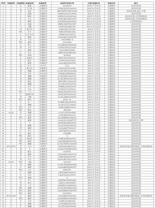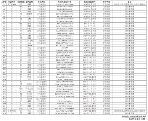 根据《中华人民共和国道路交通安全法》第一百一十二条、《中华人民共和国道路交通安全法实施条例》第一百零七条、《道路交通事故处理程序规定》(公安部第146号令)第五十八条之规定,下列124辆因交通违法或交通事故被黎城县公安局交通警察大队依法扣留的车辆,驾驶人、所有人或管理人应自此公告发布之日3个月内,持公安机关交通管理部门强制措施凭证及其他相关手续到扣留车辆的交警大队接受处理,逾期不来接受处理的,公安机关交通管理部门将对扣留的车辆依法处理。
