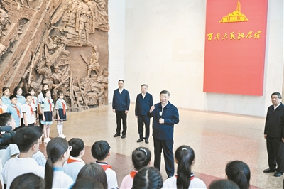 7月7日至8日,中共中央总书记、国家主席、中央军委主席习近平在山西考察。这是7日下午,习近平在位于阳泉市狮脑山的百团大战纪念馆考察时,同前来参观的青少年学生和纪念馆工作人员亲切交流。 新华社记者 殷博古 摄