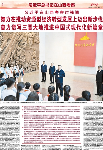 新华社太原7月8日电 中共中央总书记、国家主席、中央军委主席习近平近日在山西考察时强调,山西要认真落实党中央关于促进中部地区加快崛起、推动黄河流域生态保护和高质量发展等战略部署,坚持稳中求进工作总基调,完整准确全面贯彻新发展理念,统筹好发展和安全,努力在推动资源型经济转型发展上迈出新步伐,奋力谱写三晋大地推进中国式现代化新篇章。