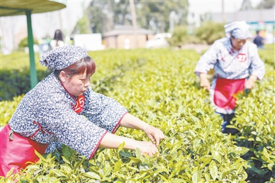 4月18日,选手在重庆市永川区何埂镇石笋山茶园采茶。