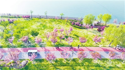 4月19日,长治漳泽湖国家城市湿地公园内,游客们在樱花大道或闲庭信步,或驻足观赏。进入4月,公园内各种花卉次第绽放,与绿地、碧湖、步道交织出一幅瑰丽画卷。 本报记者 张国平 摄
