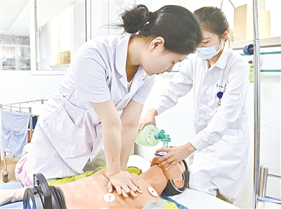 5月8日,在位于沈阳的中国医科大学附属第一医院内,实习护士在练习心肺复苏术。