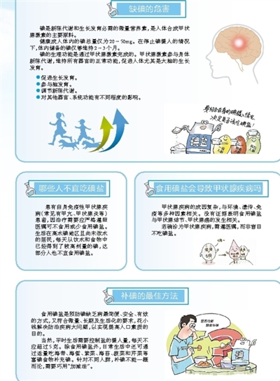 人体自身无法合成碘元素,必须完全依赖自然环境摄取。碘缺乏会造成身体甲状腺激素合成不足,导致一系列临床或亚临床症状,包括无力、精力(体力和脑力)不足、精神不集中、易疲劳、工作效率下降等。由此可见,碘在维持机体健康过程中意义重大。碘摄入不足可导致碘缺乏病,该病是由于自然环境中碘缺乏而引起机体碘营养不良所表现的一组疾病的总称,包括地方性甲状腺肿、地方性克汀病(以痴呆、矮小、聋、哑、瘫痪为主要临床特征)、地方性亚临床克汀病(以智力低下为主要临床特征),以及孕妇碘缺乏导致的流产、早产、死产和新生儿先天畸形等。