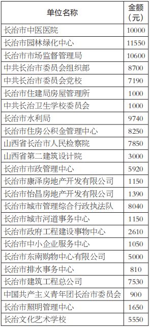 根据《中共长治市委办公室、长治市人民政府办公室关于开展“送温暖、献爱心”社会捐助活动的通知》,截至目前,共接收捐款720199元(不含市政协捐至省民政厅5000元)。现将市直单位捐款情况公告如下: