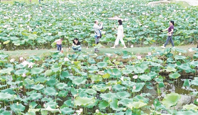 5月25日,游客在广西贺州市平桂区鹅塘镇栗木村一处乡间荷塘观赏荷花。 新华社发(廖祖平 摄)