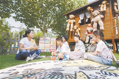 5月25日,小朋友在河北省遵化市小厂乡一景区参加户外儿童绘本学习。 新华社发(刘满仓 摄)