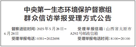 根据工作安排,中央第一生态环境保护督察组督察进驻时间为1个月。进驻期间(2025年5月28日-6月28日)设立专门值班电话:0351-2022698,专门邮政信箱:山西省太原市A292号邮政信箱。督察组受理举报电话时间为每天8:00-20:00。根据党中央、国务院要求和督察组职责,中央生态环境保护督察组主要受理山西省生态环境保护方面的来信来电信访举报,其他不属于受理范围的信访举报问题,将按规定交由被督察地方处理。