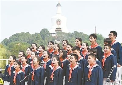 当日,第三届“让我们荡起双桨”首都少年儿童庆祝“六一”国际儿童节主题活动在北京北海公园举办。来自北京市10支少年合唱团的少先队员们在白塔下放歌,庆祝即将到来的儿童节。