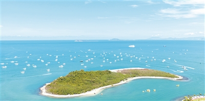 6月24日,众多游艇在海南三亚湾海面上驰骋(无人机照片)。