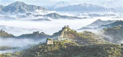 7月13日清晨,雨后的河北省遵化市境内洪山口古长城云蒸霞蔚,古长城、云海、山峦浑然一体,壮美如画。