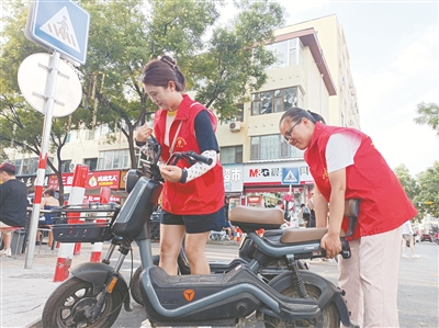 7月18日,潞州区桥北社区志愿服务队在桥北小吃街等人员密集区域开展文明出行宣传活动。图为志愿服务者在规范停放电动自行车。