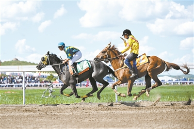 7月20日,通辽市代表队骑师特布沁(左)和赛马“戴安娜”在速度赛马5000米比赛中超越赤峰市代表队骑师斯琴图和赛马“宝枣哲日德”。当日,内蒙古自治区第十一届少数民族传统体育运动会赛马比赛在赤峰市巴林右旗举行。 新华社记者 贝赫 摄