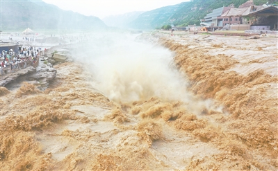 近日,受上游降雨影响,黄河晋陕峡谷水量大涨,位于山西吉县和陕西宜川县交界的壶口瀑布迎来伏汛,主副瀑布连成一线。