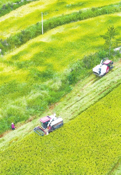 8月23日,在重庆市梁平区礼让镇新华村,农民驾驶收割机收割稻谷(无人机照片)。