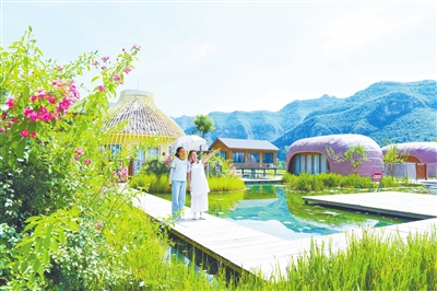 8月28日,黎城县西井镇源泉村丹泉小镇内,游客在欣赏美景。近年来,该县依托当地山水资源优势与民俗文化,盘活闲置农房,培育文旅新业态,激活乡村振兴新动能,带动村民在家门口就业增收。