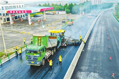 近日,国道208线改扩建工程(襄垣段)沥青上面层摊铺作业启动,标志着该工程建设全面提速,为年底主线贯通奠定坚实基础。图为工人们正在紧张施工。