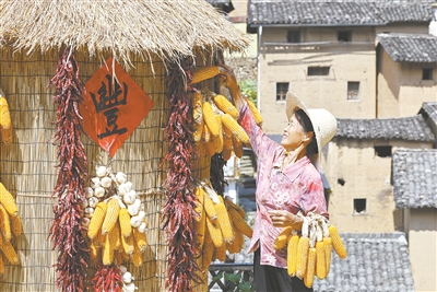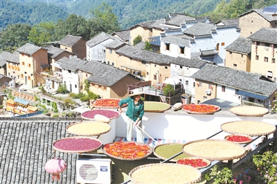 秋收时节,在安徽省黄山市歙县深渡镇阳产村,村民利用晴好天气,抓紧晾晒收获的辣椒、玉米、山核桃等农作物,描绘出一幅山村“晒秋”图。