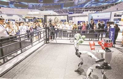 9月25日,在第四届全球数字贸易博览会数智未来主题展区的杭州六小龙专区,宇树科技的人形机器人在进行格斗擂台赛。