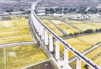 9月22日,一列火车经过内蒙古准格尔旗的稻田(无人机照片)。
