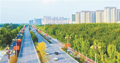 9月29日,潞州区滨湖大道道路两侧悬挂起五星红旗。一面面国旗随风飘扬,营造出热烈、喜庆的节日氛围。