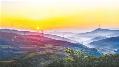 9月30日清晨,潞城区云岩山,一轮红日喷薄而出,万道霞光为层层叠叠的梯田镶上金边。连绵的群山间,一座座风车在风中悠然转动,与蜿蜒的田埂、缭绕的云雾共同构成了一幅美丽的生态画卷。