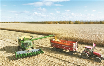 10月8日,在北大荒集团黑龙江格球山农场有限公司玉米地块,农机在卸粮(无人机照片)。寒露时节,黑龙江省各地抢抓农时忙农事,田间地头一片繁忙景象。 新华社发(陆文祥 摄)